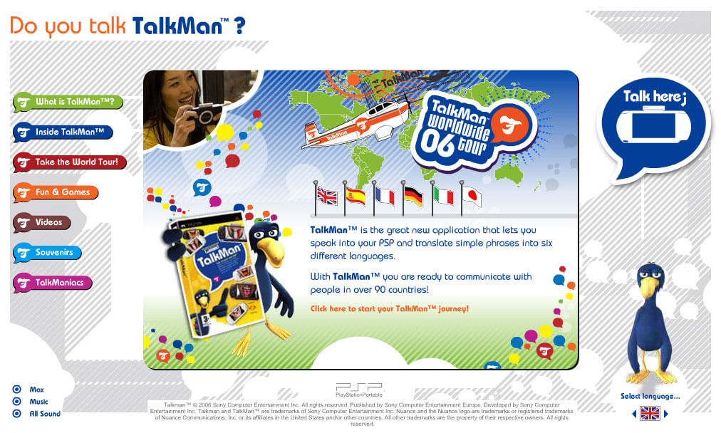 The TalkMan product is voice-activated translation software designed for the Sony PSP games console, that operates in eight languages. It was launched in the US and UK markets in 2008 as one of the first truly novel uses for the new console technology.