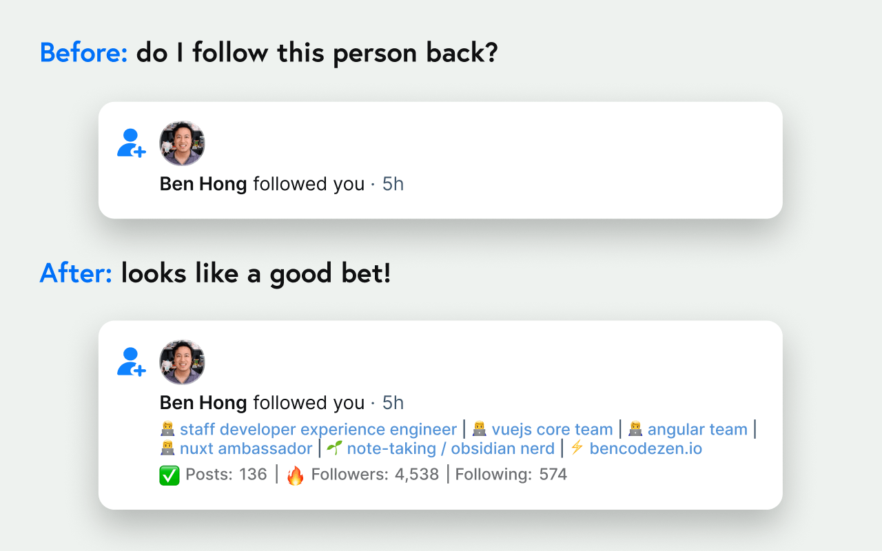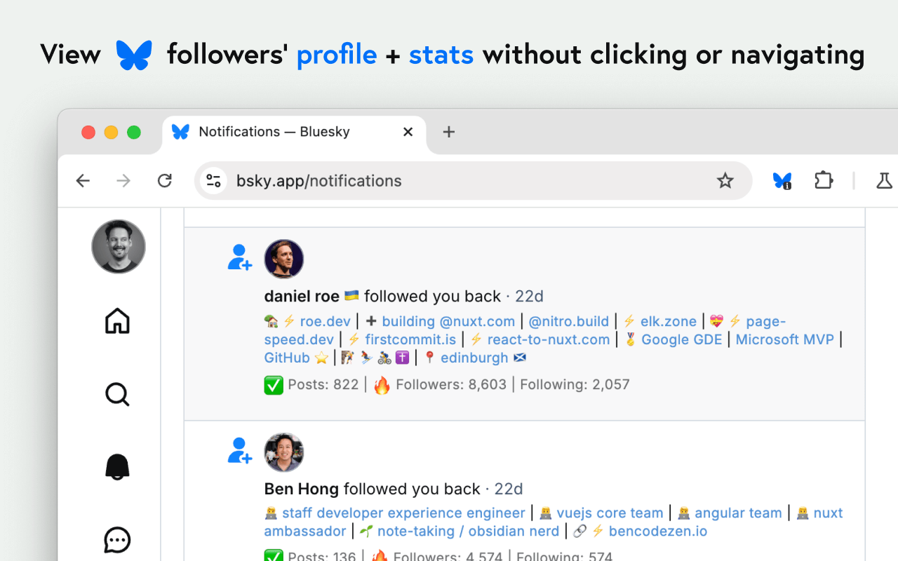 Bluesky Follower Info is a Chrome extension that inserts users' profile descriptions, engagement and popularity stats directly in the page: